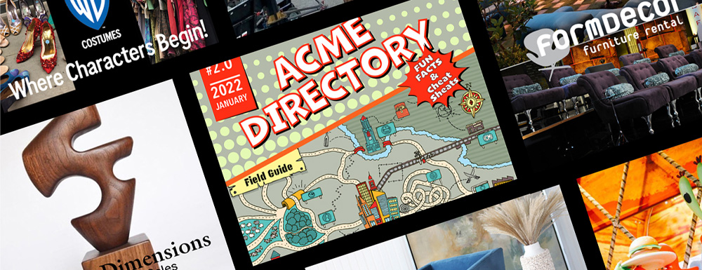 The ACME Directory is used by costume designers, set decorators, property masters, art directors, art department coordinators, prop makers, and other creative professionals who depend on reliable vendors and hard-to-find materials.